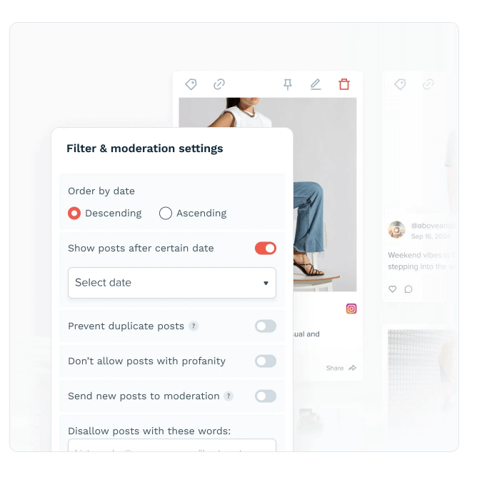 Moderate posts manually before they are published on your website to fully control the content of your website. This is especially handy when displaying user-generated content or hashtag feed content, where you’ll want to ensure everything is up to your brand’s standards before it’s live on your website.