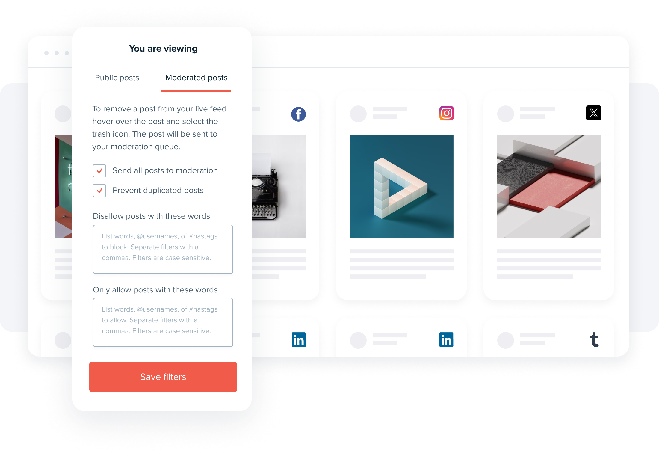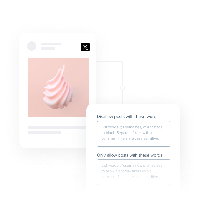 You don’t need to moderate each social post, you can automatically set social media moderation filters to disallow certain posts. Simply enter the chosen word into the “Disallow” field with various capitalizations separated by commas to ensure all variations of this word won’t pop up in your feed.