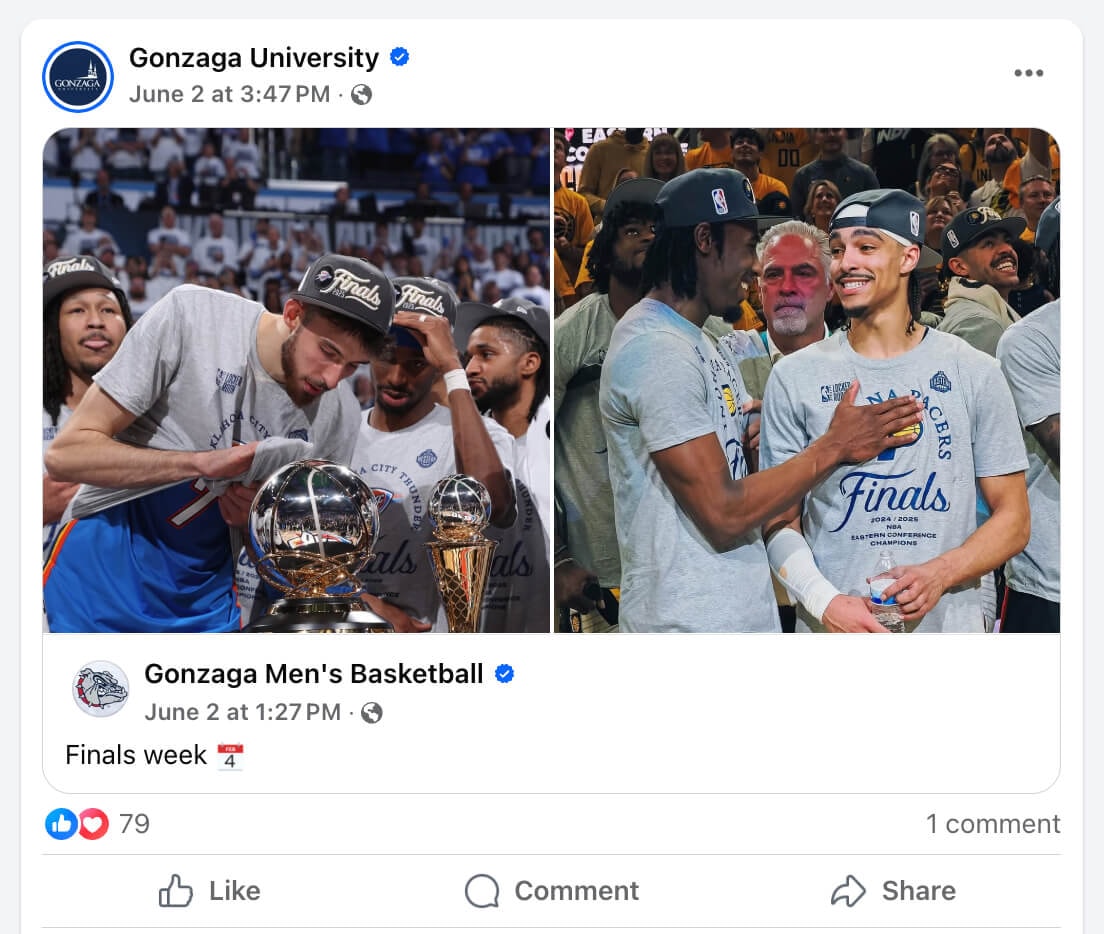 For major announcements, the official university account can reshare content posted by the niche group and broadcast it on its broader platform. Here’s an example of Gonzaga University’s Facebook page sharing the content from their basketball team:
