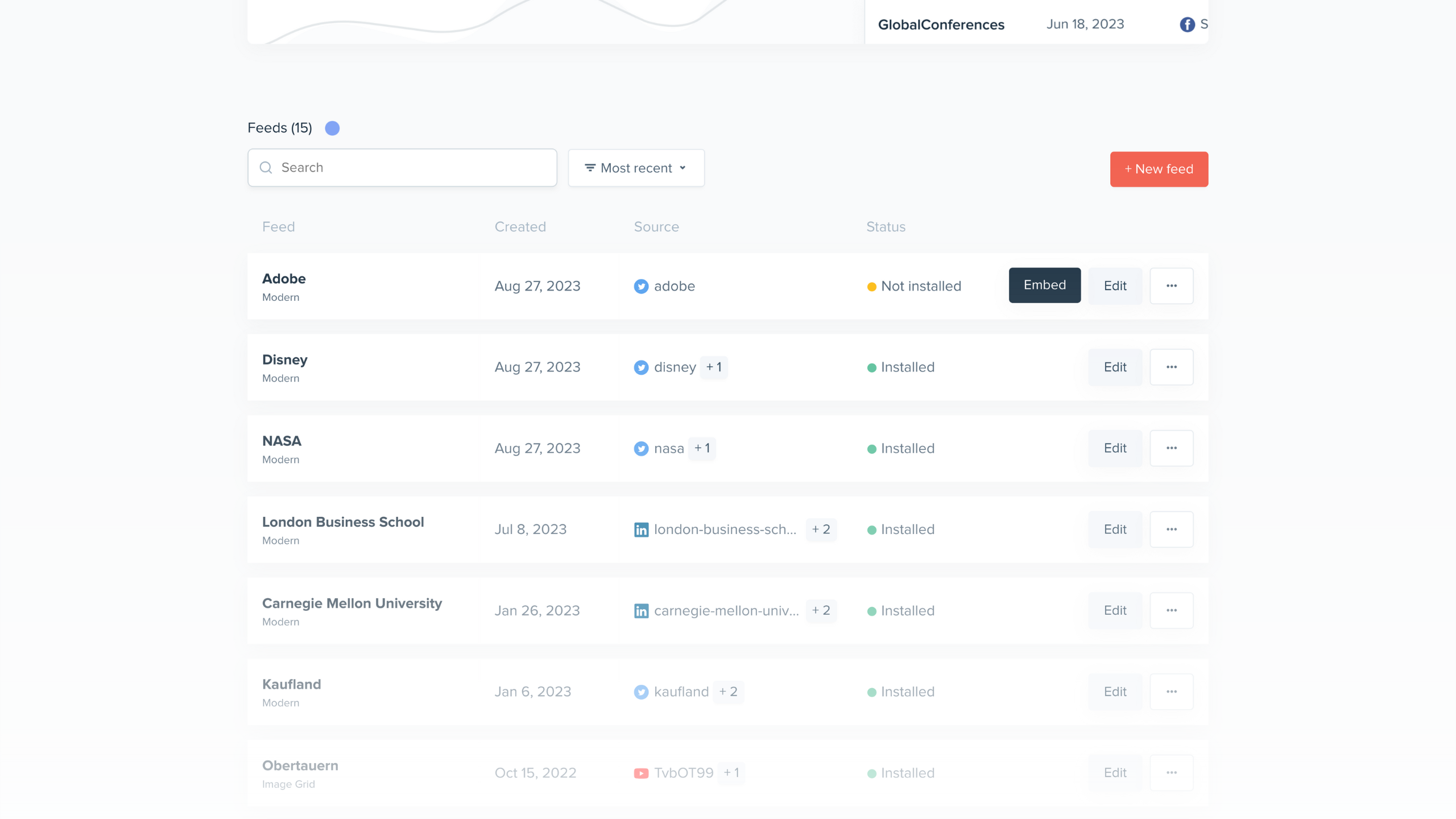 Additionally, you’ll be able to see the status of each feed at a glance—whether it’s already embedded on a website or still needs installation.