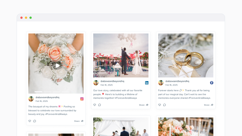 Juicer allows you to create a beautiful social wall that collects and displays all the posts tagged with your wedding hashtag in real time. Whether your guests are sharing photos, videos, or heartfelt messages, Juicer will automatically pull them together into one stunning feed. Place this feed on your wedding website or project it during the reception to keep everyone connected and engaged.