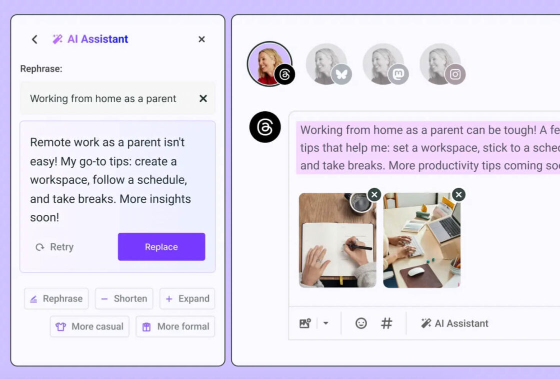 Features: Generates content, auto-suggests hashtags, changes tone, detects audience.