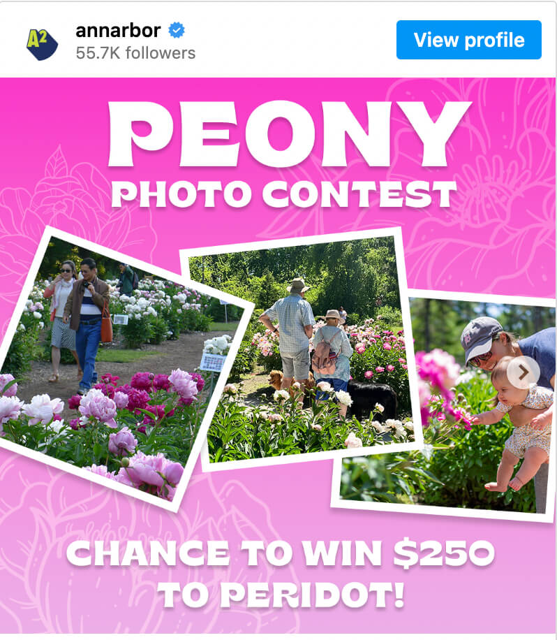 For example, Destination Ann Arbor’s had a contest around peony season at the University of Michigan’s Nichols Arboretum.